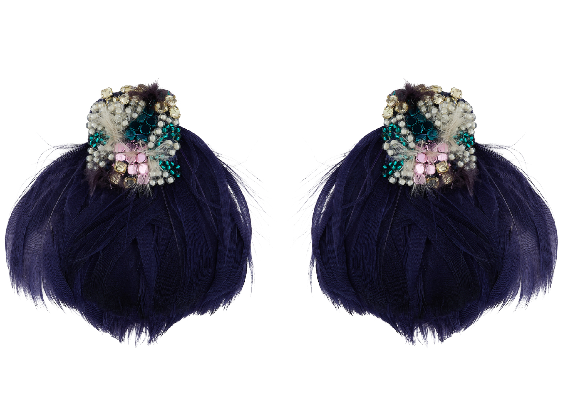 Add a little pizzazz to your ears! These chic mixed media earrings feature deep navy feathers alongside multi-colored crystals for surprising pops of color and no shortage of flair.