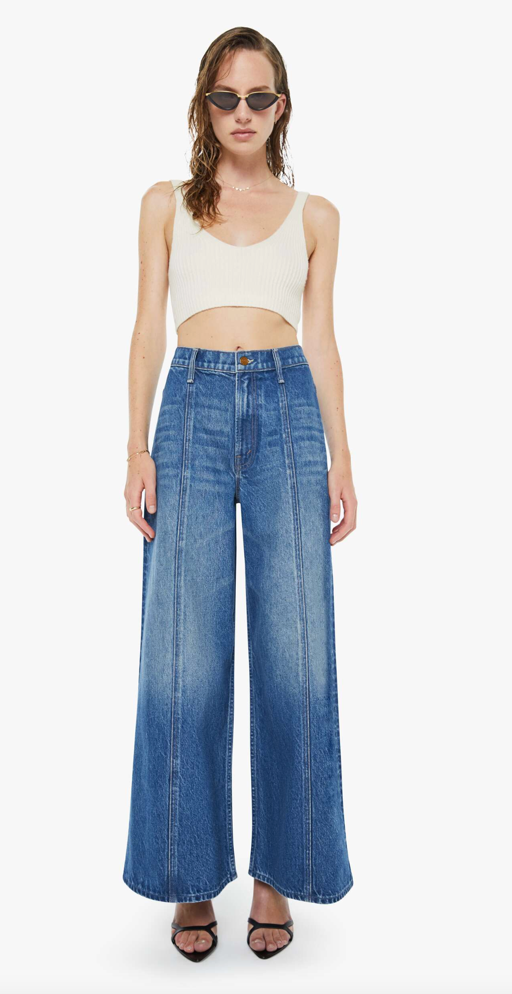 Experimental and non-era specific. For everyone, or not. The high-waisted pants have a zip fly, loose, wide leg with seamed details down the front and a 28.5-inch inseam with a clean hem. They're made from rigid denim in a mid-blue with whiskering, fading, a pretzel-detailed button and candy-inspired interior rivets. Would you like a treat?