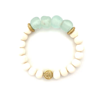 Bracelet fits a wrist up to 7 inches around, and features recycled aqua glass and brass beads in the middle. Wear it alone or stack with others.