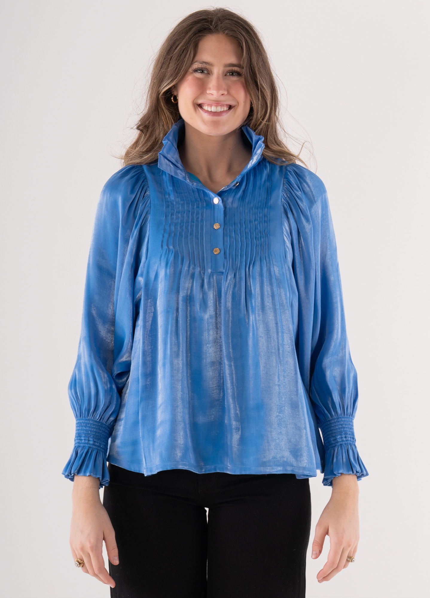 The Charlotte Top in Sapphire features a ruffled stand collar, pin tuck pleats along the front, smocked sleeves with ruffle cuffs, and a partial button front closure. Crafted in a silk blend, the fabrication is woven with shimmering threads that reflect light beautifully, adding subtle dimension to its fluid silhouette.